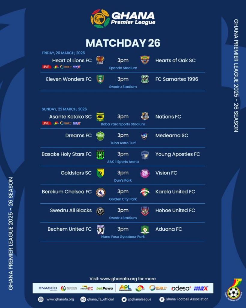 Matchday 26 of the 2025/26 Ghana Premier League gets underway this weekend, with fixtures spread across multiple venues nationwide.