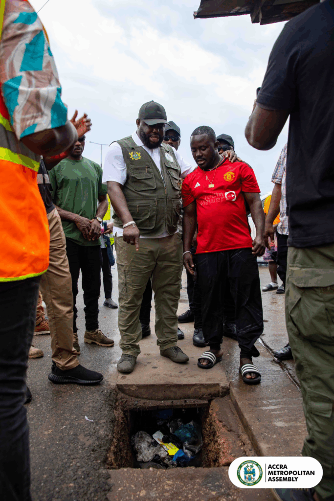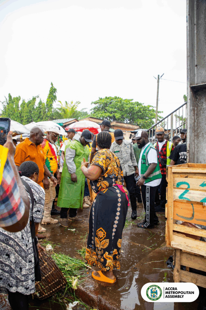 At the Kaneshie Market, the Mayor, together with the Municipal Chief Executive for Ablekuma Central, Hon. Frank Nkansah, inspected sections of the market affected by flooding.