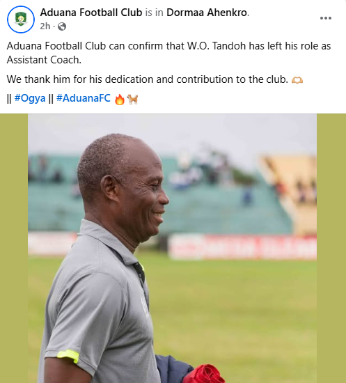 “Aduana Football Club can confirm that W.O. Tandoh has left his role as Assistant Coach,” the club said in a statement. “We thank him for his dedication and contribution to the club.”