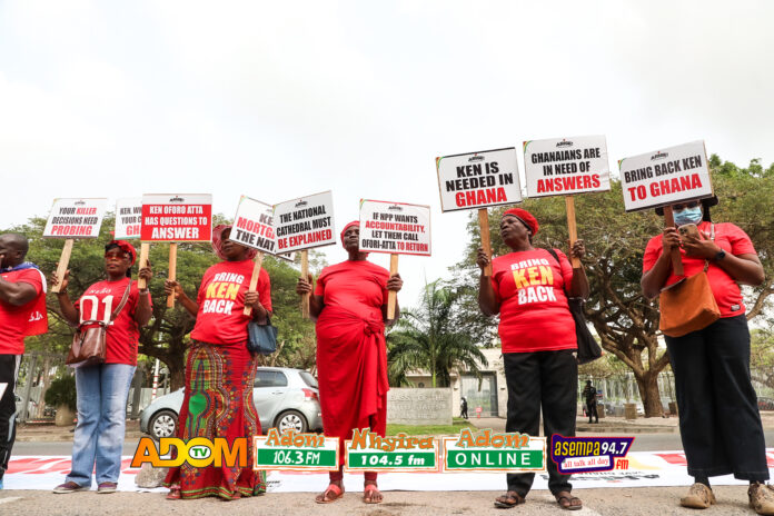 Protesters carried placards with inscriptions such as “Let Ofori-Atta Face Justice,” “Ken Is Needed in Ghana,” and “Ghanaians Are in Need of Answers,” while others wore branded T-shirts bearing the message “Bring Ken Home.”