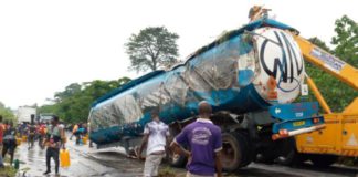 Abafour, Nkwaakwaa residents siphon fuel from overturned Burkinabe tanker [Photos]