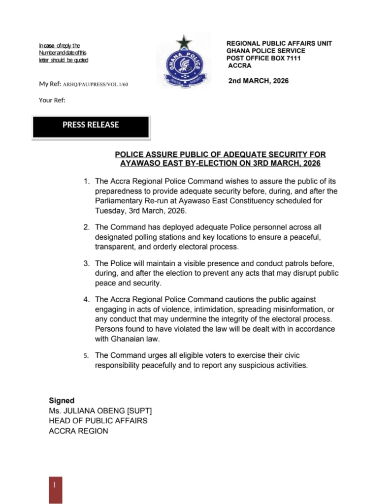 The Accra Region Police Command has assured the public of its readiness to provide comprehensive security before, during, and after the parliamentary re-run election in Ayawaso East Constituency scheduled for Tuesday, March 3, 2026.