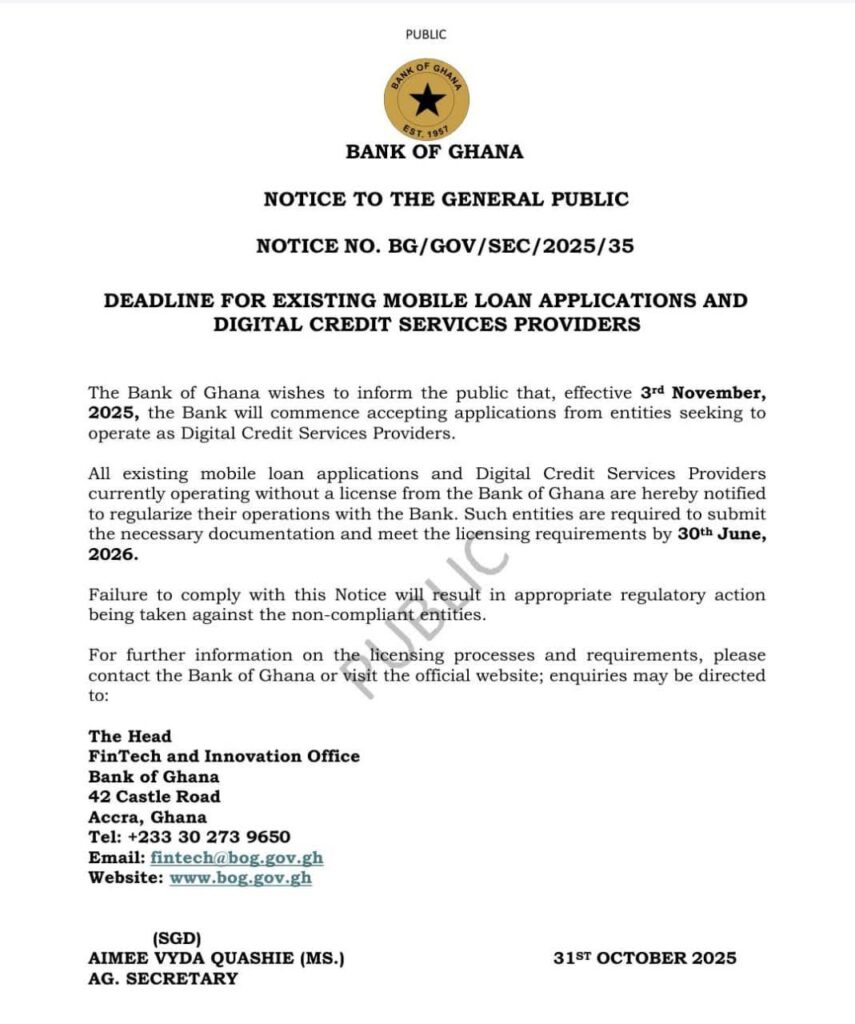 In a public notice signed by Acting Secretary Aimee Vyda Quashie, the central bank stated that all existing operators in the digital credit space must regularise their activities with the Bank by June 30, 2026.