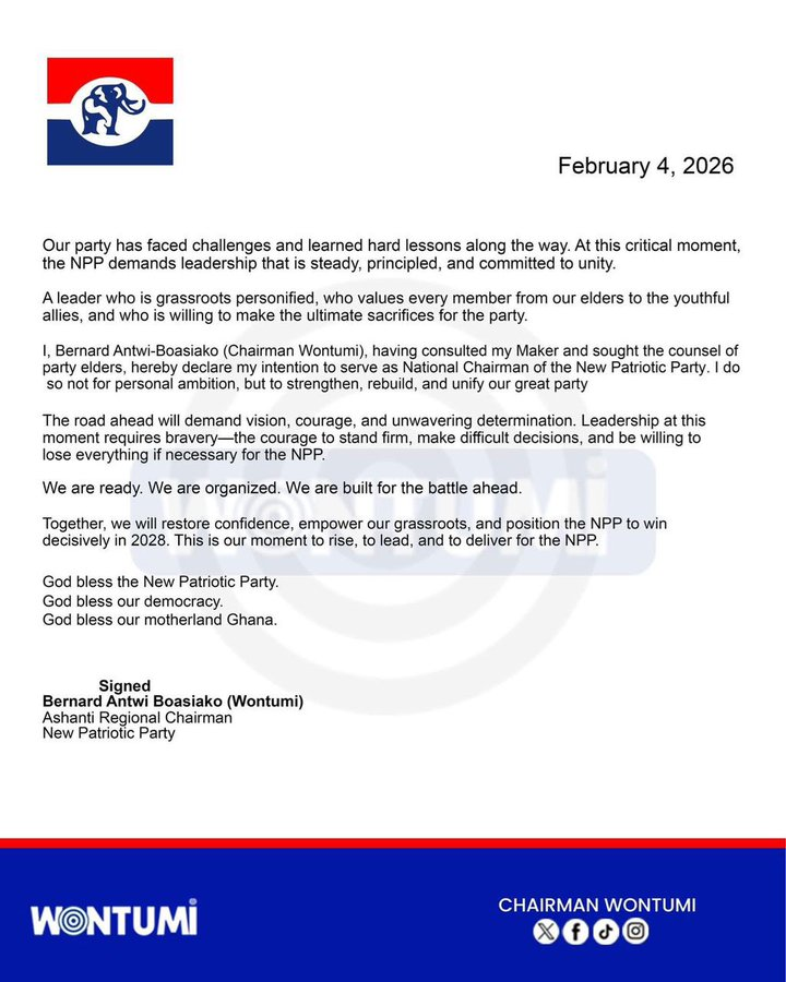 In a statement dated February 4, 2026, Chairman Wontumi said the NPP is at a critical juncture that requires strong, unified, and principled leadership to rebuild and reposition the party for victory in the 2028 general elections.