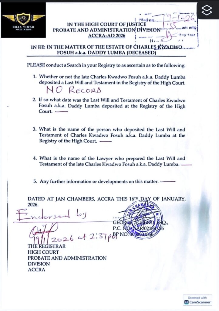 However, the registry’s response, dated January 19, 2026, at 2:37 pm, revealed that “there is no record of any will deposited by Daddy Lumba.”