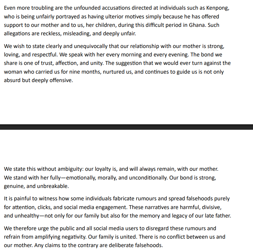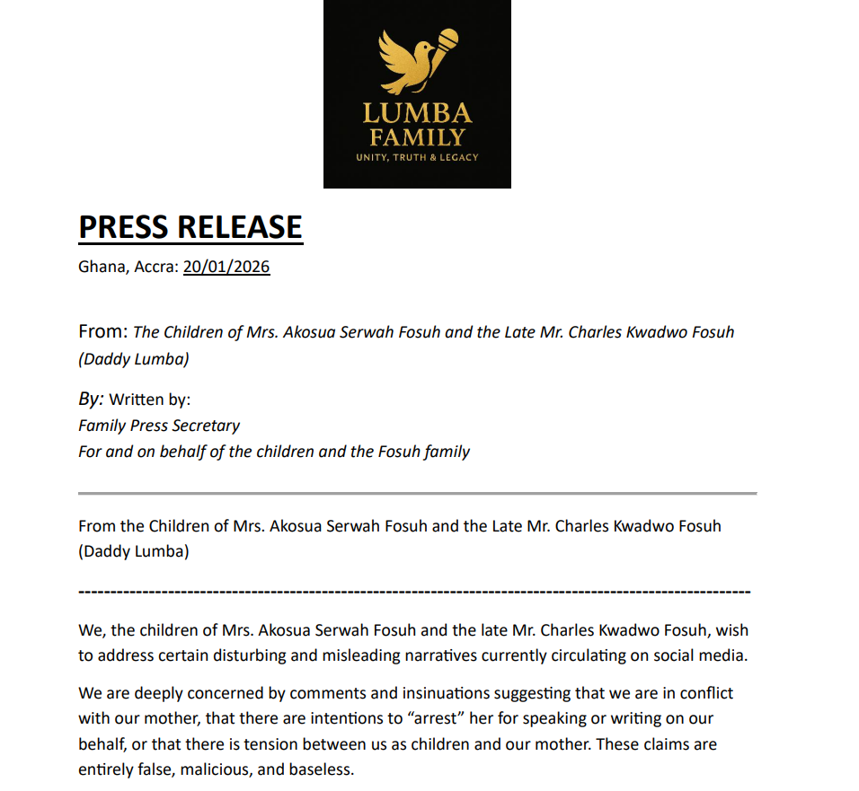 In a statement issued in Accra on January 20, 2026, the family described the claims as false, malicious, and deeply offensive, stressing that there is no conflict within the family.