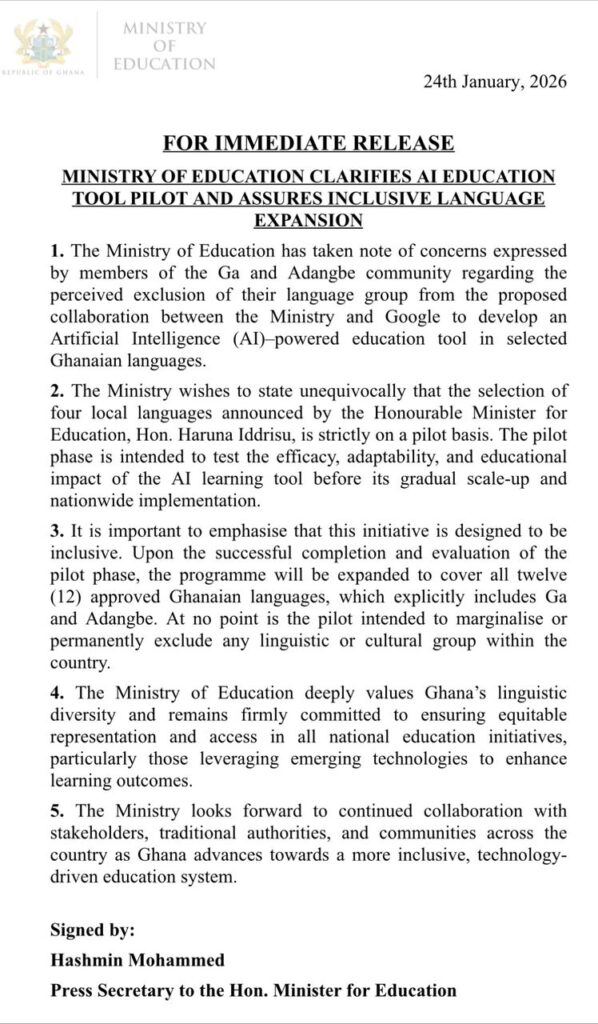 The Ministry of Education has addressed concerns raised by members of the Ga and Adangbe community over the exclusion of their languages from a proposed Artificial Intelligence (AI)–powered education tool being developed in partnership with Google.
