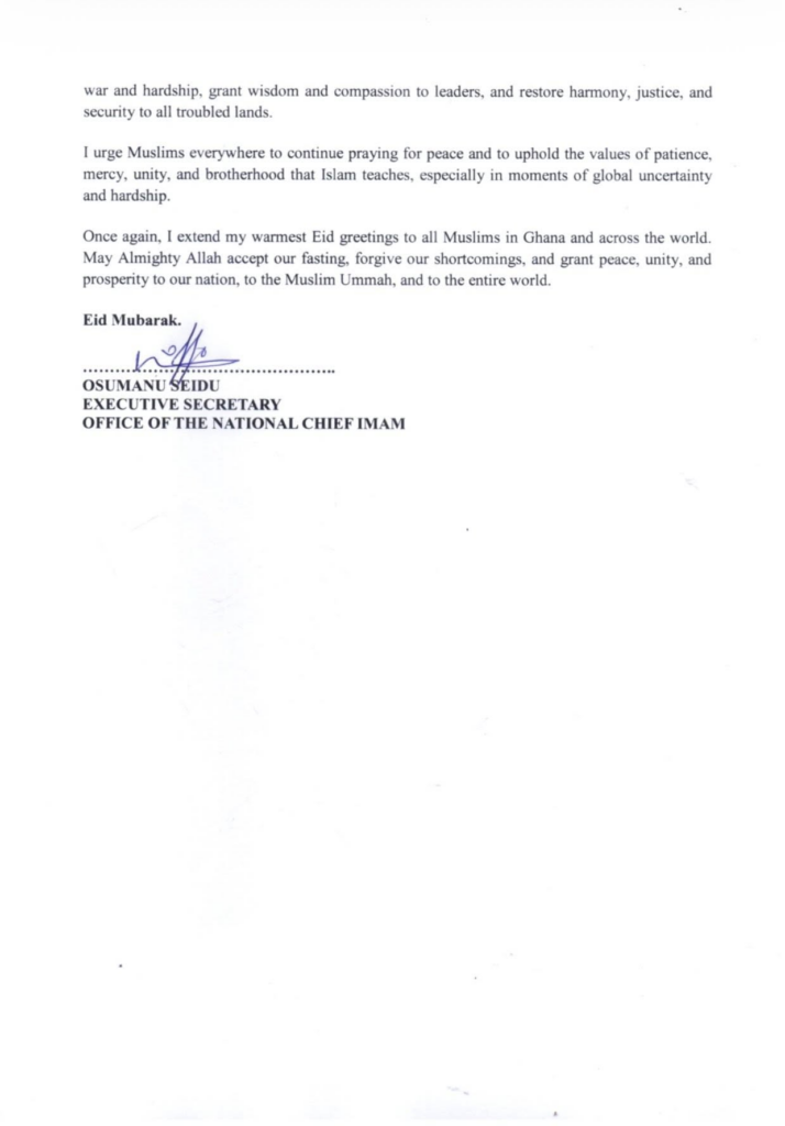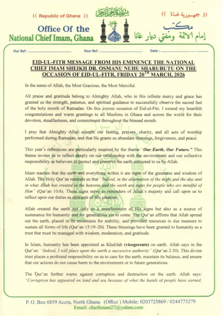 In a statement signed by Osmanu Seidu on behalf of Sheikh Dr Osman Nuhu Sharubutu, the Office extended warm Eid-ul-Fitr greetings to Muslims in Ghana and across the globe following the successful completion of Ramadan.