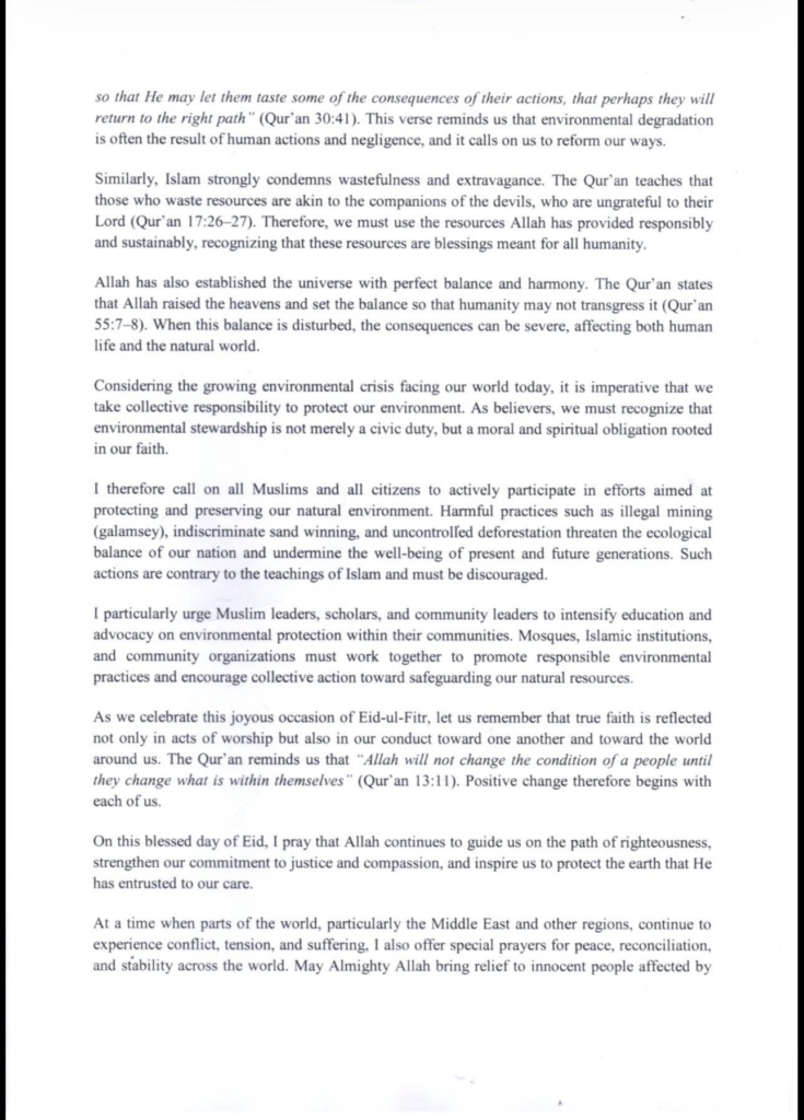 A major highlight of the message was the theme “Our Earth, Our Future,” which underscores environmental protection as both a moral and religious duty.
