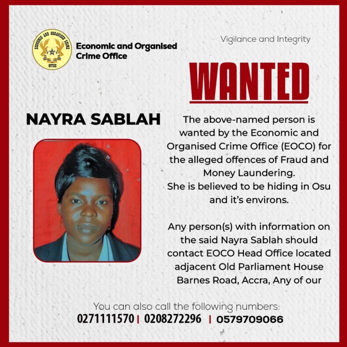 EOCO urged individuals with knowledge of her whereabouts to report to its head office, located adjacent to the Old Parliament House on Barnes Road in Accra.