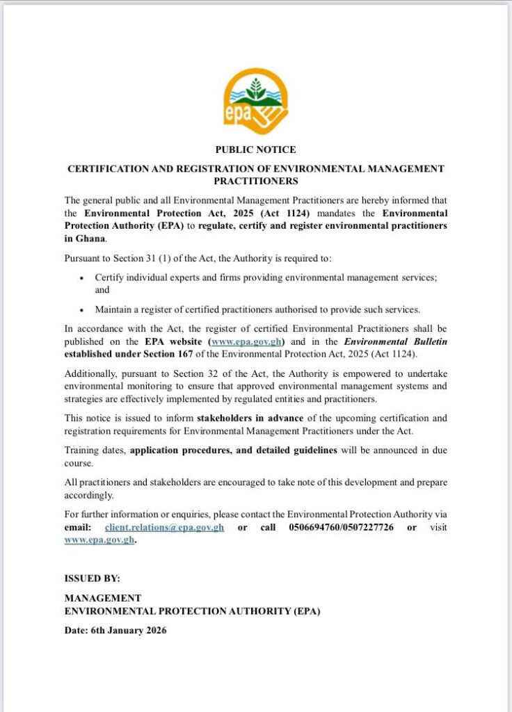 The Environmental Protection Authority (EPA) has announced plans to commence the certification and registration of Environmental Management Practitioners in Ghana, in line with the Environmental Protection Act, 2025 (Act 1124).
