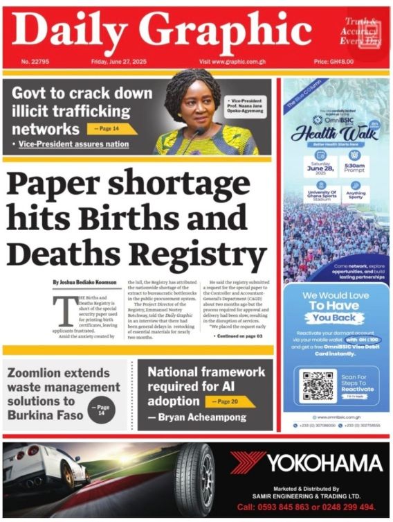Friday June 27 2025 Newspaper Headlines Newspaper Headlines June 27, 2025 7:34 am - Audio By Carbonatix FacebookWhatsAppTwitterTelegramEmailPinterestPrint Previous articleRetired Police Officers Association dissociates itself from suit challenging Kofi Boakye’s nominationNext articleEducation Minister to present scholarship bill to Parliament TagsNewspaper headlines RELATED ARTICLES Local News Asantehene demands enforcement of law recognising Naba Azoka II as Bawku Chief Local News Government to issue position on Bawku peace mediation report within 24 hours Local News Bryan Acheampong says Bawumia is his biggest competitor in NPP race
