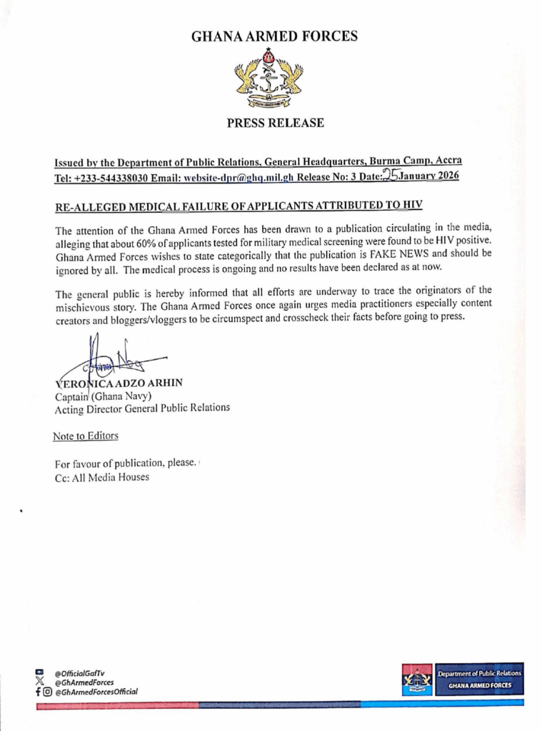 The Ghana Armed Forces (GAF) has dismissed as false claims circulating in the media that about 60 per cent of applicants who participated in the ongoing military recruitment exercise were declared medically unfit after allegedly testing positive for HIV.