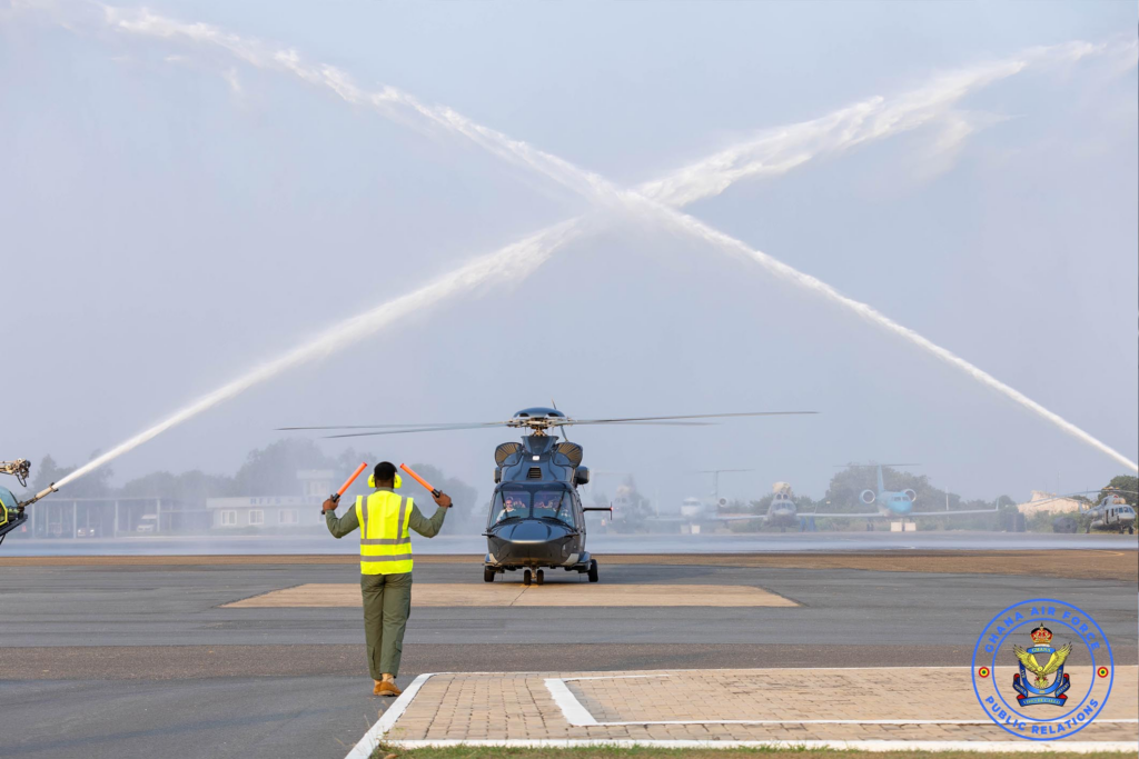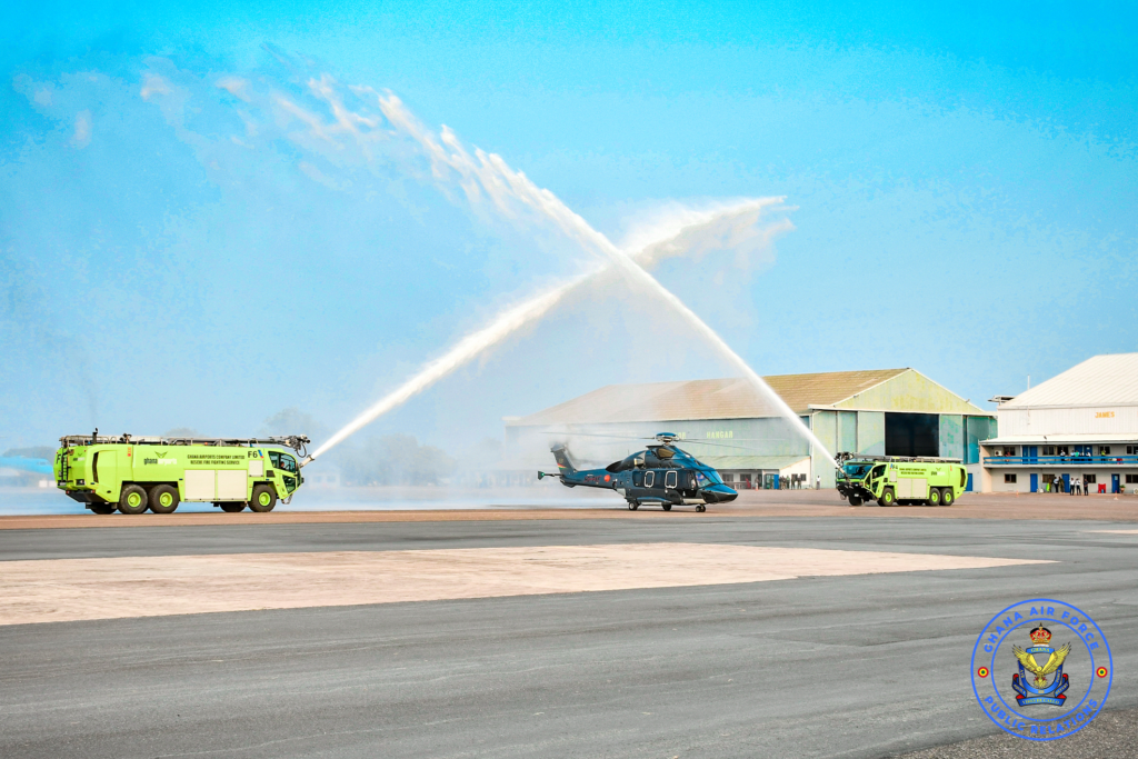 Upon its arrival at the Air Force Base in Accra, the helicopter was welcomed with a traditional water cannon salute, a ceremonial aviation gesture in which airport fire trucks spray arcs of water over an aircraft as it taxis beneath.