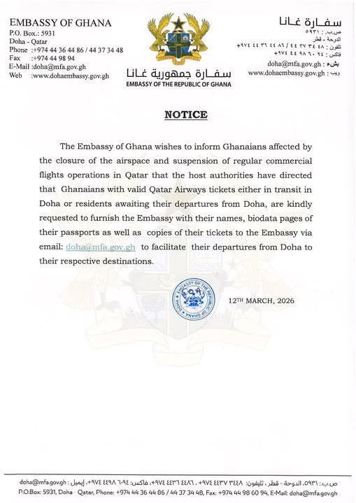 “The Embassy of Ghana wishes to inform citizens affected by the closure of airspace and suspension of regular flights in Qatar that the host authorities have instructed all Ghanaians with valid Qatar Airways tickets, whether in transit or awaiting departure, to provide their names, passport biodata pages, and ticket copies to the Embassy to facilitate their return to Ghana or onward destinations,” the notice said.