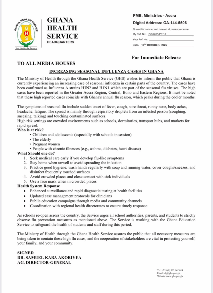 The Ministry of Health, through the Ghana Health Service (GHS), has confirmed an increase in seasonal influenza cases across parts of the country.