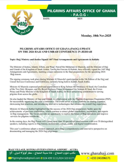 The Pilgrims Affairs Office of Ghana (PAOG) has announced that Ghana’s Minister of Justice and Islamic Affairs, Nawaaf Ibn Mohammed Al Mazawda, and Saudi Arabia’s Minister of Hajj and Umrah, Tawfiq Ibn Fawzan Al Rabiah, have signed the final arrangements and agreements for the 1447 Hajj season in Jeddah.