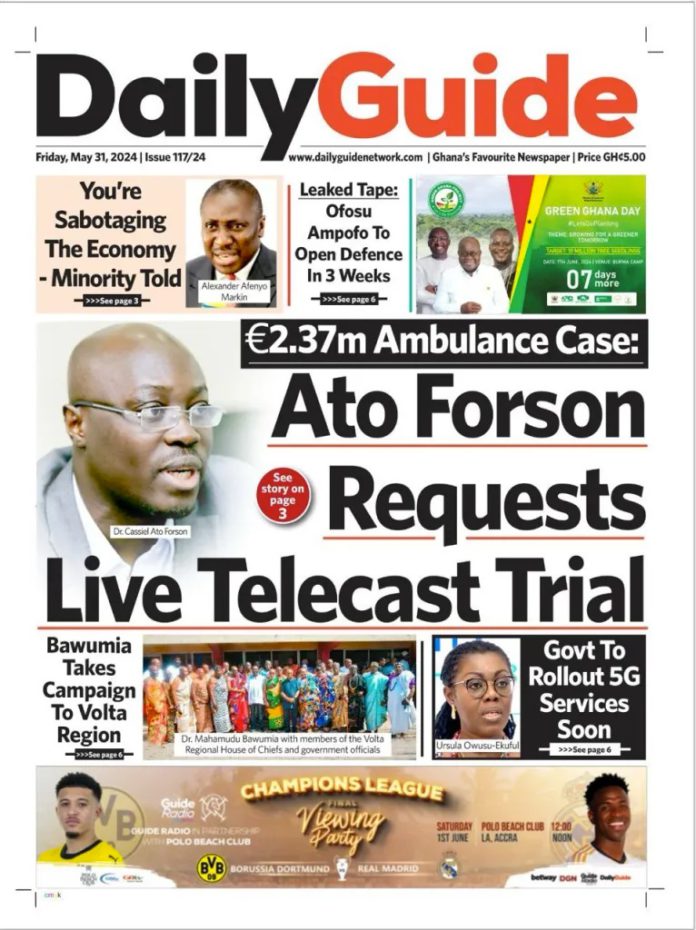 Ghanaian newspaper headlines: Friday 31st May 2024 Newspaper Headlines May 31, 2024 9:53 am - Audio By Carbonatix FacebookWhatsAppTwitterTelegramEmailPinterestPrint Previous articleAfrica Finance Corporation (AFC’s) Samaila Zubairu, African Development Bank (AfDB’s) Akinwumi Adesina, Idris Elba Headline 10th Edition of The Africa Debate in LondonNext articleCharles Bissue’s case against OSP arrest warrant reassigned and postponed RELATED ARTICLES Newspaper Headlines Newspaper headlines: Monday, November 24, 2025 Newspaper Headlines Newspaper headlines: Friday, November 21, 2025 Newspaper Headlines Newspaper headlines: Thursday, November 20, 2025