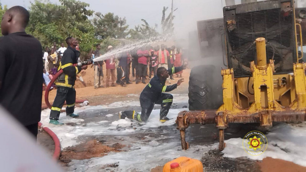 A grader working on the Ajumako–Swedru Road expansion project was destroyed by fire after it caught flames at Ajumako Amia.