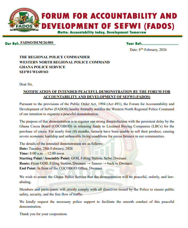 A concerned civil society group, the Forum for Accountability and Development of Sefwi (FADOS), has petitioned the Ghana Police Service in the Western North Region over a planned demonstration to protest delays in payments to cocoa farmers.