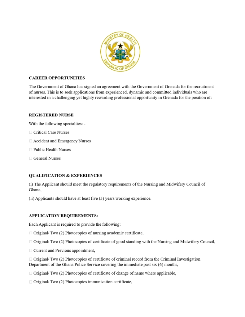The Ministry of Health has begun accepting applications from qualified Ghanaian nurses interested in working in Grenada.