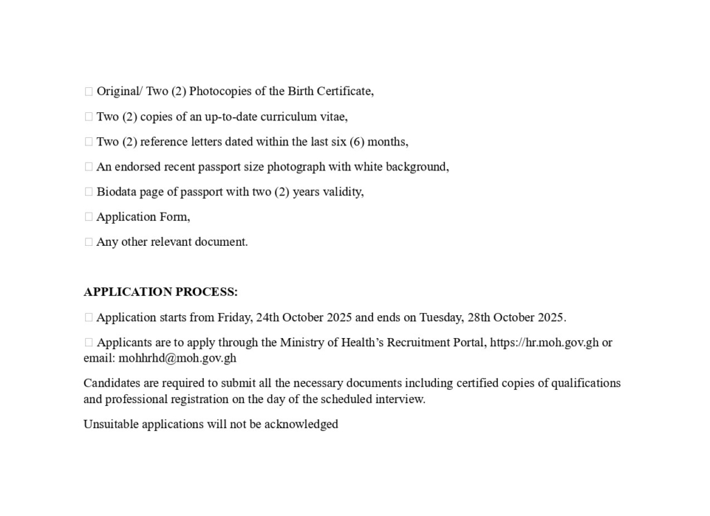 The application window runs from Friday, October 24 to Tuesday, October 28, 2025, through the Ministry of Health’s online recruitment portal.