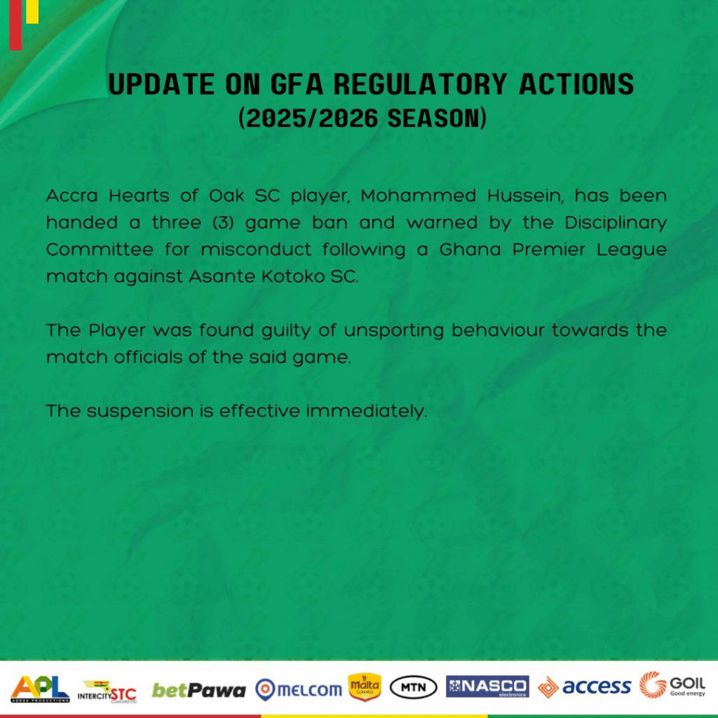 The Ghana Football Association’s (GFA) Disciplinary Committee has handed Hearts of Oak midfielder Hussein Mohammed a three-match suspension, effective immediately.