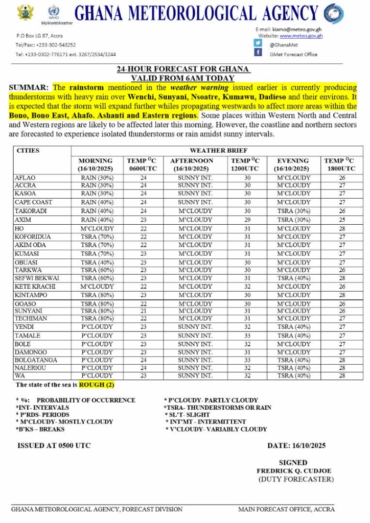 According to the agency, a weak rainstorm currently gaining intensity is producing thunderstorms with heavy rain over Wenchi, Sunyani, Nsoatre, Kumawu, and Dadieso and their surrounding areas.