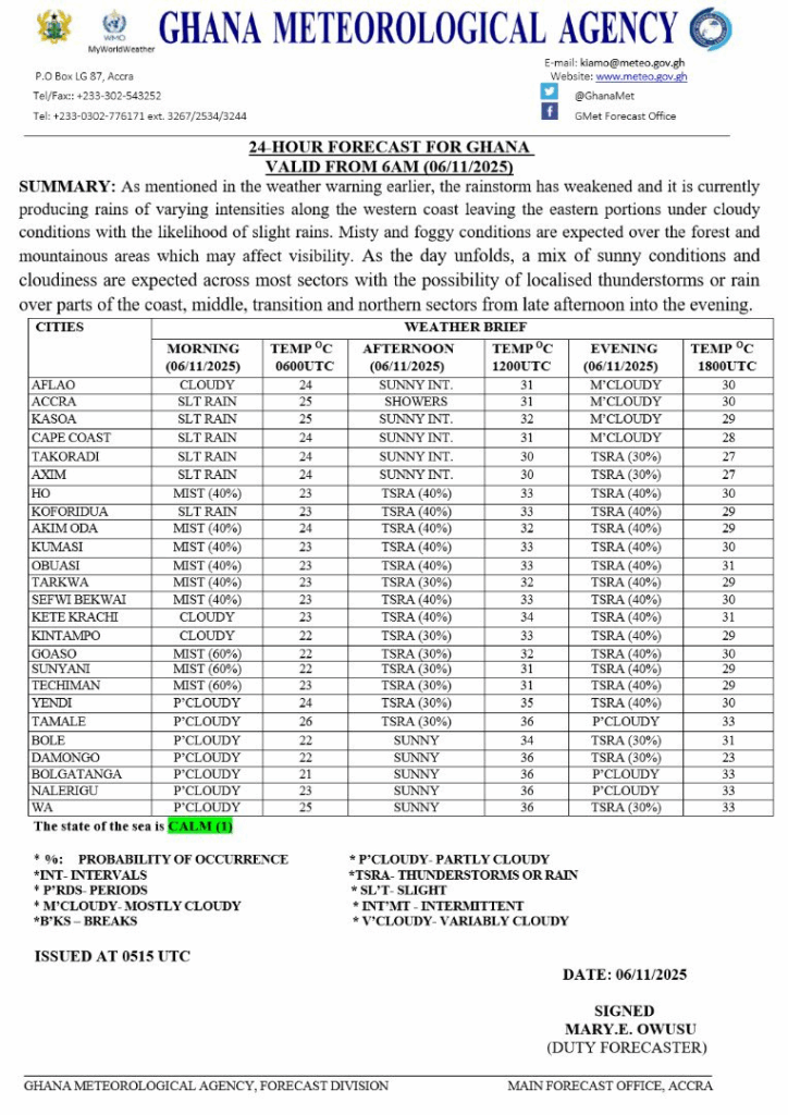 Meanwhile, residents along the coast from Takoradi to Accra can expect sunny intervals with isolated showers, and the sea is forecast to remain calm.