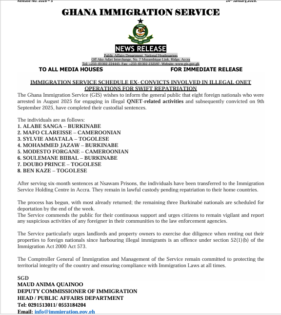 In a statement signed by the Head of the Public Affairs Department of the Service, Deputy Commissioner of Immigration Maud Anima Quainoo, the individuals were arrested in August 2025 and convicted on September 9, 2025.