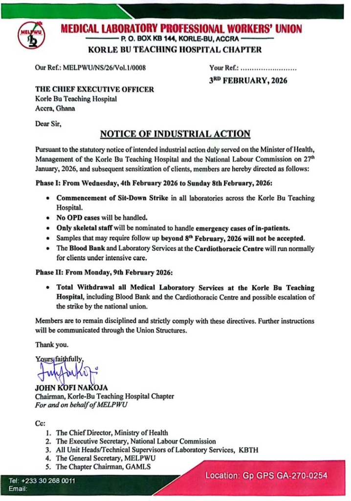 The situation is expected to worsen on Monday, February 9, 2026, when MELPWU plans a total withdrawal of laboratory services at Korle Bu, including the Blood Bank and Cardiothoracic Centre, effectively shutting down one of the hospital’s most vital diagnostic functions.