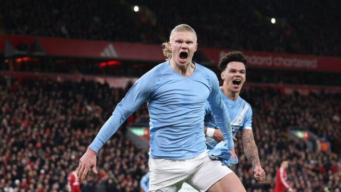 City looked deflated, but got an equaliser from out of nowhere when Erling Haaland flicked a header through to Bernardo Silva, who coolly slotted the ball through Alisson’s legs, played onside by Szoboszlai.