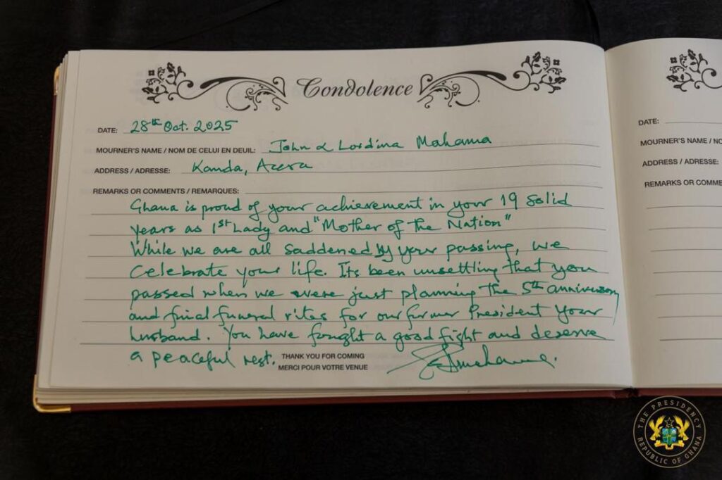 President John Mahama on Tuesday, October 28, visited the family of the late former First Lady Nana Konadu Agyeman-Rawlings to express his condolences and sign the book of condolence.