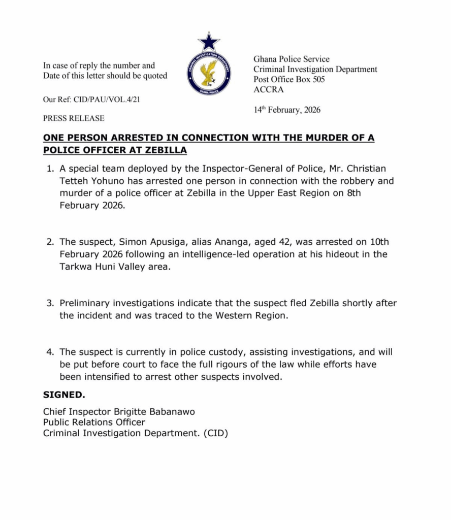 The Ghana Police Service has arrested one person in connection with the robbery and murder of a police officer at Zebilla in the Upper East Region.