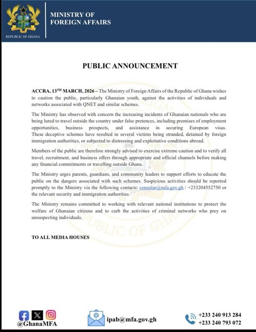 In a public notice issued on March 13, 2026, the Ministry reported a rise in cases where Ghanaians were deceived with offers of employment, business opportunities, or assistance in obtaining European visas.