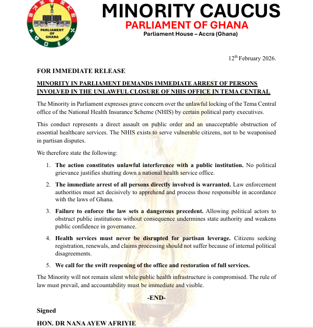 The Minority Caucus in Parliament has demanded the immediate arrest of individuals responsible for the unlawful closure of the National Health Insurance Scheme (NHIS) office in Tema Central.