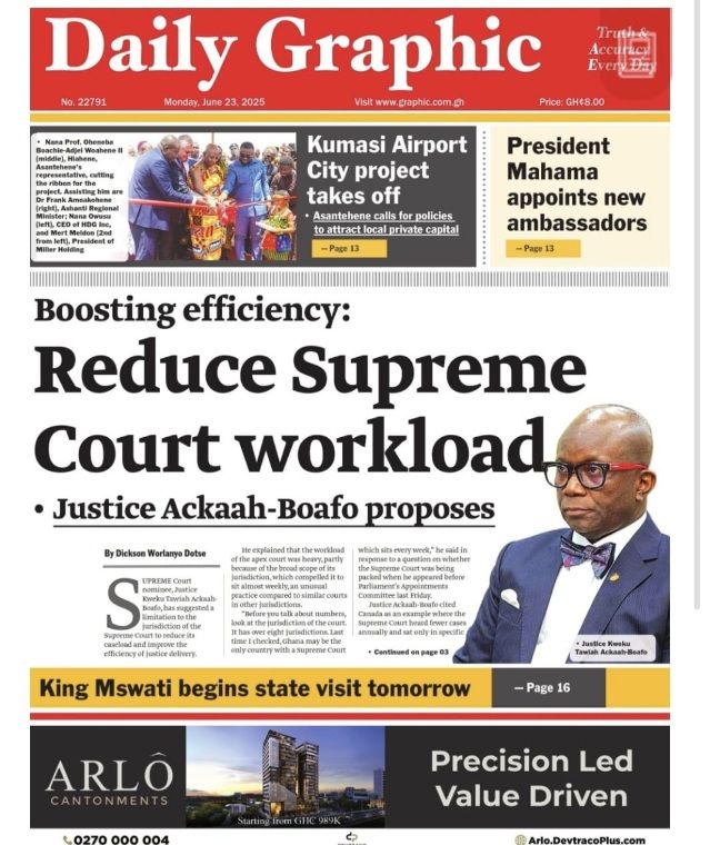 Monday June 23 2025 Newspaper Headlines Newspaper Headlines June 23, 2025 7:09 am - Audio By Carbonatix FacebookWhatsAppTwitterTelegramEmailPinterestPrint Previous articleBlack Queens could have scored more against Malawi – Coach BjorkegrenNext articleNavrongo traditional leaders urge Mahama to intervene in looming chieftaincy crisis RELATED ARTICLES Local News Minority calls for Lands Minister’s removal over withdrawn Lithium Agreement Entertainment I’m divorced – Nana Ama Mcbrown reveals Local News Obuasi Police arrest 40 suspects in coordinated anti-crime operations