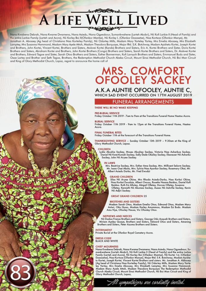 Mrs. Comfort Ofooley Sackey ServicesObituary October 9, 2019 12:18 pm - Audio By Carbonatix FacebookWhatsAppTwitterTelegramEmailPinterestPrint Previous articleI don’t go after ladies who are already in relationships – Joey BNext article#Sexforgrade: MP appeals to Ghanaians to forgive Prof. Gyampo (Listen) RELATED ARTICLES Obituary Obituary: Samuel Teye Mensah Nartey aka DJ Awana Obituary Obituary: Juliana Merley Martey Obituary Mr Kofi Amponsah-Efah