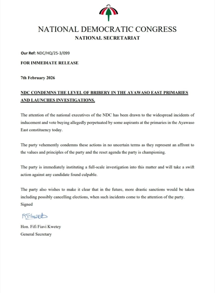 The National Democratic Congress (NDC) has strongly condemned reports of bribery and vote-buying during its parliamentary primaries in the Ayawaso East Constituency and announced the immediate launch of investigations into the alleged misconduct.