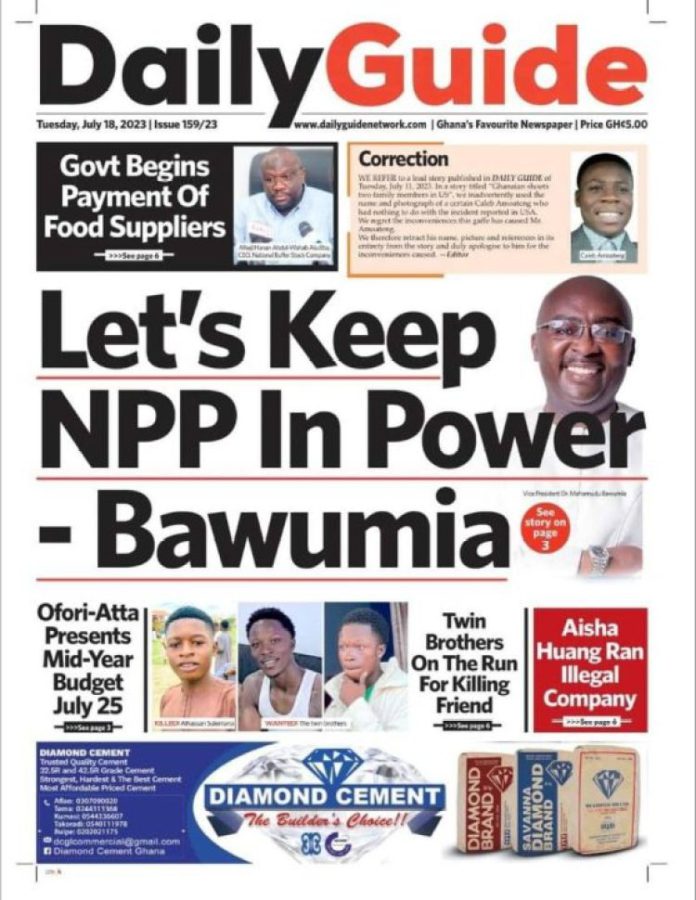 Newspaper Headline: Tuesday, July 18, 2023 Newspaper Headlines July 18, 2023 7:25 am - Audio By Carbonatix FacebookWhatsAppTwitterTelegramEmailPinterestPrint Previous articleWe are not land guards; we working for the state – Aynok Holding LimitedNext articleAkufo-Addo leaves for state visit in Portugal and Italy RELATED ARTICLES Local News Walewale: Gunmen open fire on bus, two critically injured Local News Oppong Nkrumah hands over classroom blocks to boost education in Akyemansa Hot Audio The party was fatigued – Bryan Acheampong explains why he entered NPP flagbearer race [Video]