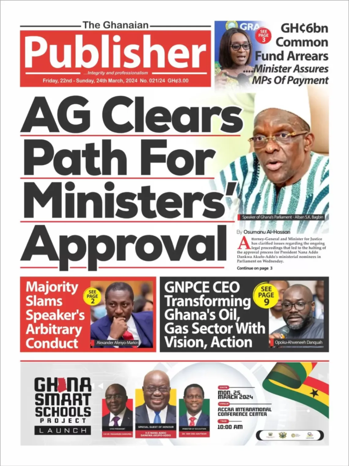 Newspaper headlines: Friday 22nd March 2024 Newspaper Headlines March 22, 2024 6:46 am - Audio By Carbonatix FacebookWhatsAppTwitterTelegramEmailPinterestPrint Previous articleStriking teachers to meet Employment Ministry todayNext articleCanon adds new Cinema RAW Light recording formats to Electro-Optical System (EOS) C500 Mark II via firmware update TagsNewspaper headlines RELATED ARTICLES Politics Ken Agyapong lacks temperament for presidency, he can beat up a cabinet minister – Atta Akyea Local News Ato Forson sets record in paying contractors – Roads Minister Agbodza Education Education Ministry announces payment of outstanding teacher allowances