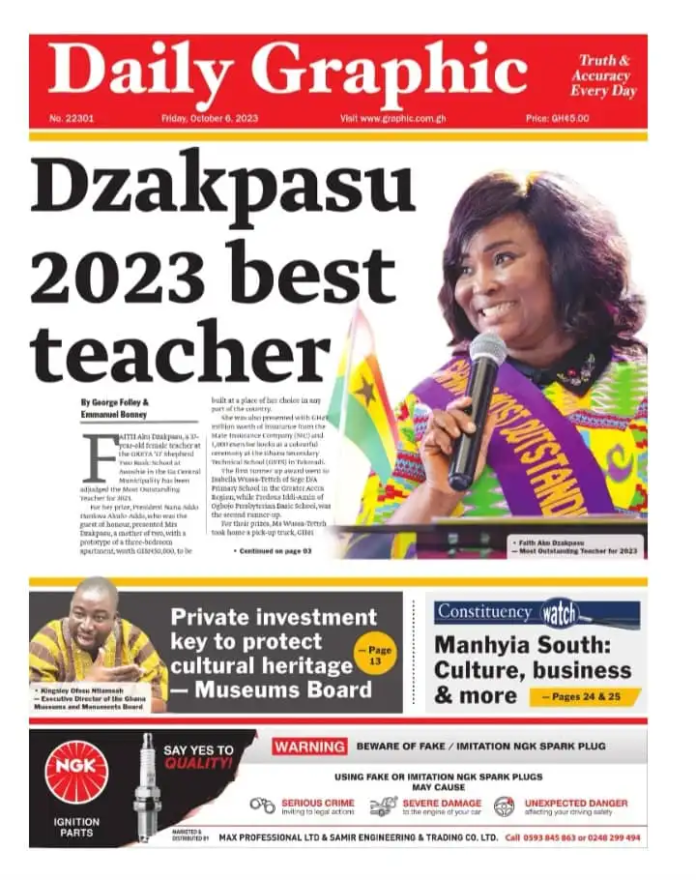 Newspaper headlines: Friday 6th October 2023 Newspaper Headlines October 6, 2023 8:27 am - Audio By Carbonatix FacebookWhatsAppTwitterTelegramEmailPinterestPrint Previous articleECG, GWCL, NEDCo pay GH¢I.2m as compensation to customers  Next articleMohbad: Wanted friend of musician turns himself in RELATED ARTICLES Newspaper Headlines Newspaper headlines: Monday, November 24, 2025 Newspaper Headlines Newspaper headlines: Friday, November 21, 2025 Newspaper Headlines Newspaper headlines: Thursday, November 20, 2025