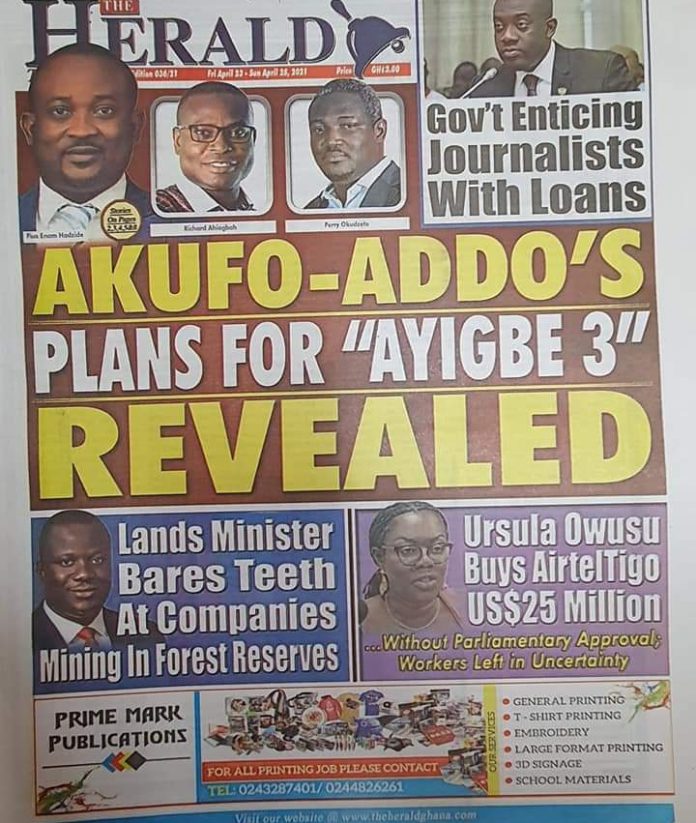Newspaper Headlines: Friday, April 23, 2021 Newspaper Headlines April 23, 2021 7:59 am - Audio By Carbonatix FacebookWhatsAppTwitterTelegramEmailPinterestPrint Previous article16 ‘galamsey’ excavators seized at Amenfi West in Western RegionNext articleUEW student found dead at Winneba beach RELATED ARTICLES Newspaper Headlines Newspaper headlines: Monday, November 24, 2025 Newspaper Headlines Newspaper headlines: Friday, November 21, 2025 Newspaper Headlines Newspaper headlines: Thursday, November 20, 2025