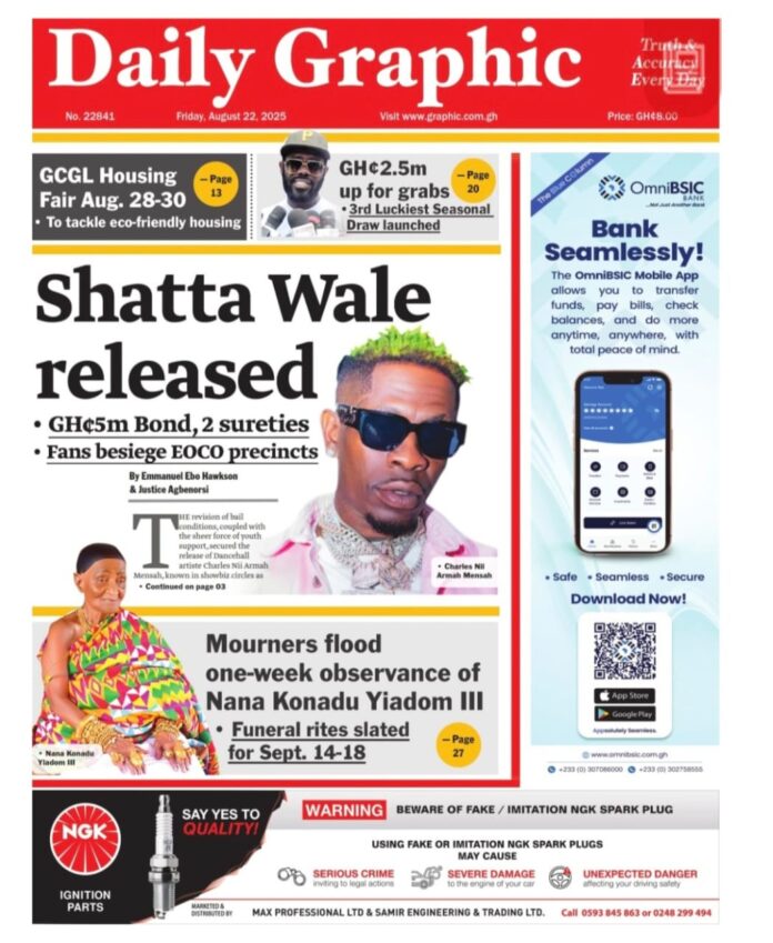 Newspaper headlines: Friday, August 22, 2025 Newspaper Headlines August 22, 2025 8:26 am - Audio By Carbonatix FacebookWhatsAppTwitterTelegramEmailPinterestPrint Previous articleKinbu SHTS students complete two-day crisis counselling following stabbing incidentNext articleAkwatia by-election: Trust police, stop fear-mongering – NDC PC urges NPP TagsNewspaper headlines RELATED ARTICLES Nigeria Nigeria’s House to look into row between regulator and Dangote over fuel imports, pricing News Ned Nwoko responds to Regina Daniels’ claims of separation from children News Three friends jailed for a total of 27 years for stealing