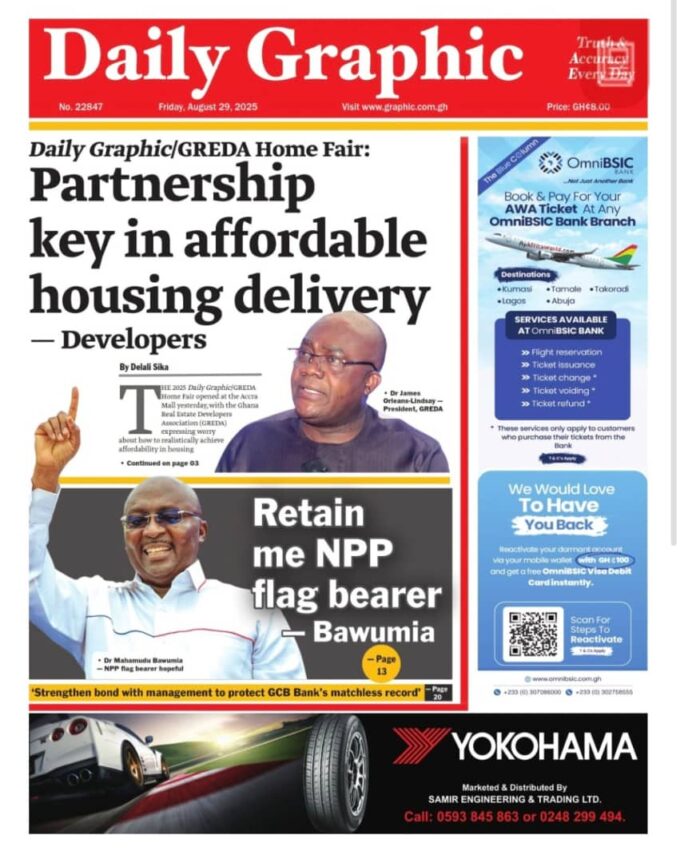 Newspaper headlines: Friday, August 29, 2025 Newspaper Headlines August 29, 2025 7:34 am - Audio By Carbonatix FacebookWhatsAppTwitterTelegramEmailPinterestPrint Previous articleFamily announces new venue for Daddy Lumba’s one-week observanceNext articleAkwatia by-election: Court throws out suit against EC TagsNewspaper headlines RELATED ARTICLES News GNFS trains fire volunteers in Tolon District to boost community fire safety Entertainment TikToker Peller arrested for reckless driving during livestream News Police arrest two suspects over viral child abuse video at Agona Jamasi