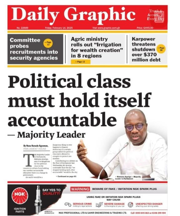 Newspaper headlines: Friday, February 14, 2025 Newspaper Headlines February 14, 2025 8:25 am - Audio By Carbonatix FacebookWhatsAppTwitterTelegramEmailPinterestPrint Previous articleAhafo Regional Minister urges RCC staff to be transparent and time-consciousNext articleMoMo vendor shot dead at Krofrom in daylight robbery [Photos+Video] TagsNewspaper headlines RELATED ARTICLES Politics Ken Agyapong lacks temperament for presidency, he can beat up a cabinet minister – Atta Akyea Local News Ato Forson sets record in paying contractors – Roads Minister Agbodza Education Education Ministry announces payment of outstanding teacher allowances