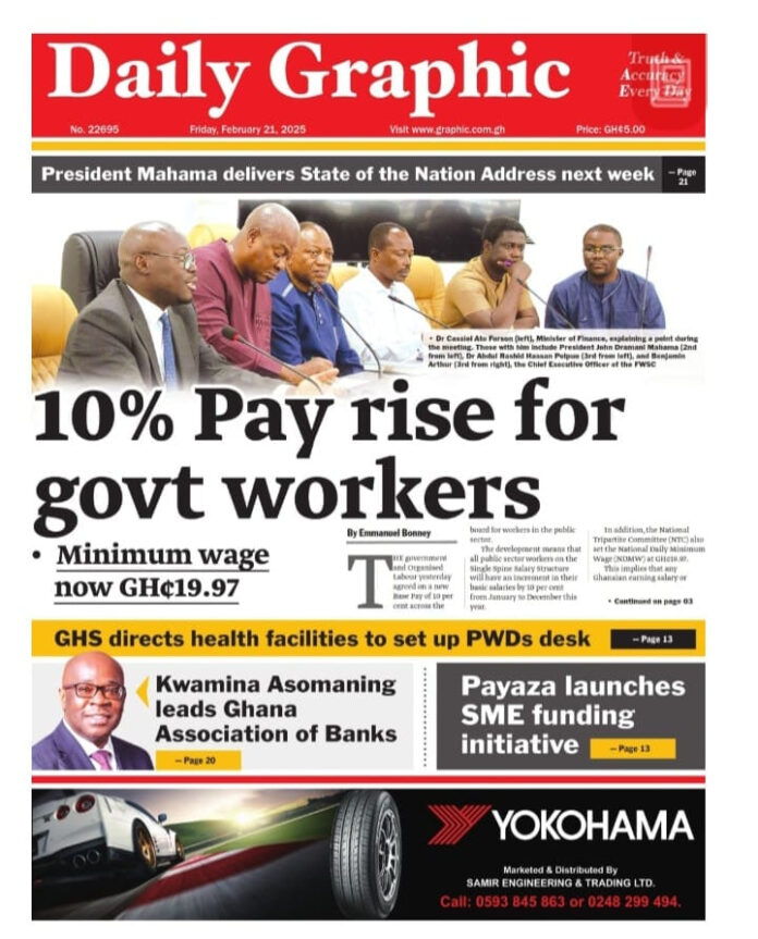 Newspaper headlines: Friday, February 21, 2025 Newspaper Headlines February 21, 2025 9:08 am - Audio By Carbonatix FacebookWhatsAppTwitterTelegramEmailPinterestPrint Previous article‘Streamline VAT or businesses will suffocate’ – AGI warns gov’tNext articleUT Bank collapse is economic injustice – Sam Jonah TagsNewspaper headlines RELATED ARTICLES Local News Walewale: Gunmen open fire on bus, two critically injured Local News Oppong Nkrumah hands over classroom blocks to boost education in Akyemansa Hot Audio The party was fatigued – Bryan Acheampong explains why he entered NPP flagbearer race [Video]