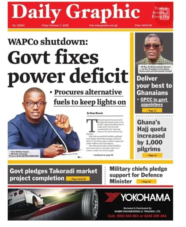 Newspaper headlines: Friday, February 7, 2025 Newspaper Headlines February 7, 2025 7:27 am - Audio By Carbonatix FacebookWhatsAppTwitterTelegramEmailPinterestPrint Previous articleAlhassan Yakubu-Tali resigns as ADB MDNext articleWe inherited $7.8m debt in 2017 – Former Hajj Board fires back TagsNewspaper headlines RELATED ARTICLES News Sam Jonah seeks Ablakwa’s intervention over alleged seizure of investments in Nigeria Local News Lands ministry engages Ewoyaa chiefs, residents in successful lithium agreement talks News Kwesi Botchway Jnr requests update from A-G on EOCO galamsey investigations