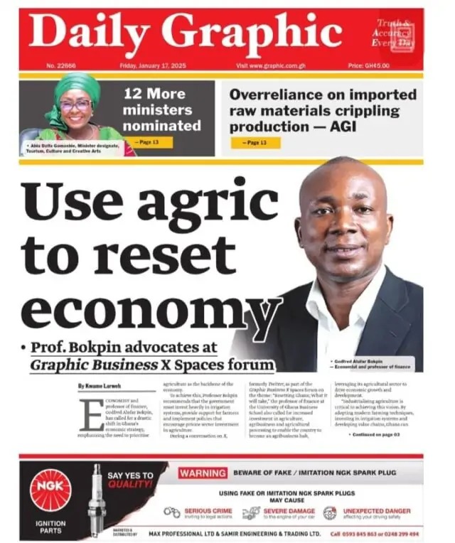 Newspaper headlines: Friday, January 17, 2025 Newspaper Headlines January 17, 2025 7:58 am - Audio By Carbonatix FacebookWhatsAppTwitterTelegramEmailPinterestPrint Previous articleSign anti-gay bill without delay – Ahiagbah to MahamaNext articleAnti-LGBTQ+ Bill: Mahama cannot simply walk away – Assin South MP TagsNewspaper headlines RELATED ARTICLES Local News Mamprugu Overlord rejects Otumfuo’s Bawku mediation report, calls process flawed Local News Shamamanhene Osagyefo Kwaw Frieku IV officially gazetted by Western Regional House of Chiefs Local News Walewale: Gunmen open fire on bus, two critically injured