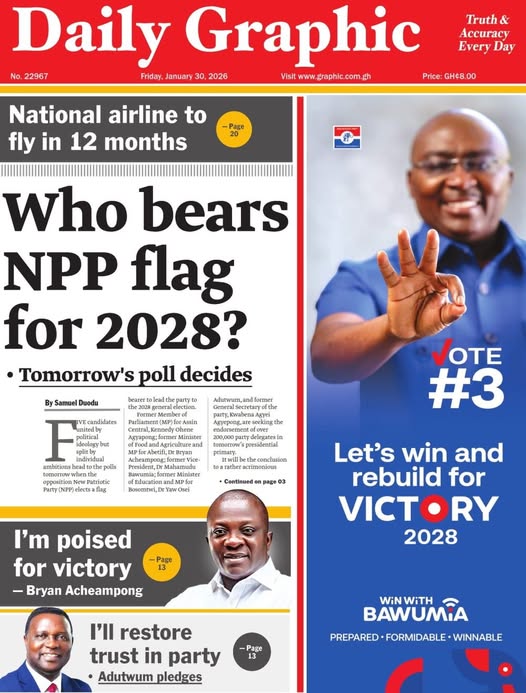 Newspaper headlines: Friday, January 30, 2026 Newspaper Headlines January 30, 2026 7:55 am - Audio By Carbonatix FacebookWhatsAppTwitterTelegramEmailPinterestPrint Previous articleBawumia factor: The experience, setbacks and a fresh NPP fightNext articleThe next big test: Can Kennedy Agyapong reshape NPP? Tagsnewspaper RELATED ARTICLES Local News OSP recovers US$2m and GH₵8.5m in anti-corruption drive New Patriotic Party The next big test: Can Kennedy Agyapong reshape NPP? Elections Bawumia factor: The experience, setbacks and a fresh NPP fight
